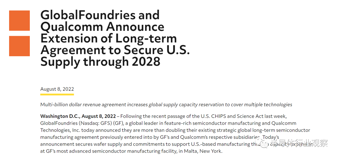 除此之外,高通也与格芯拉长了合约。8月9日相关声明显示,高通同意从格芯纽约工厂购买额外 42 亿美元的半导体芯片,这意味着高通到 2028 年的总采购额将达到 74 亿美元。高通表示,它正在将对格芯的投资增加一倍,以利用政府资金确保额外的晶圆产能。